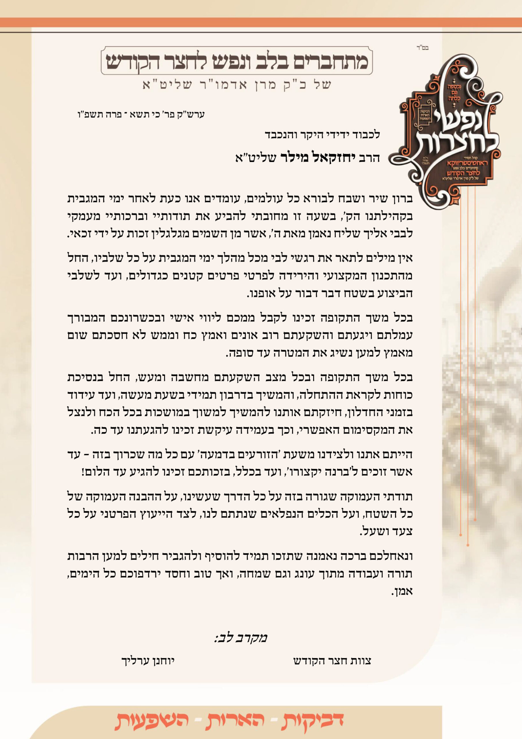 מגבית יסוד לכונן יסוד קבוע ובסיס איתן של שותפות למרכז חצר הקודש של כ"ק מרן אדמו"ר מראחמיסטריווקא שליט"א - ע"י צירוף מאות חברי קבע בשותפות נאמנה ונלהבה בס"ד!